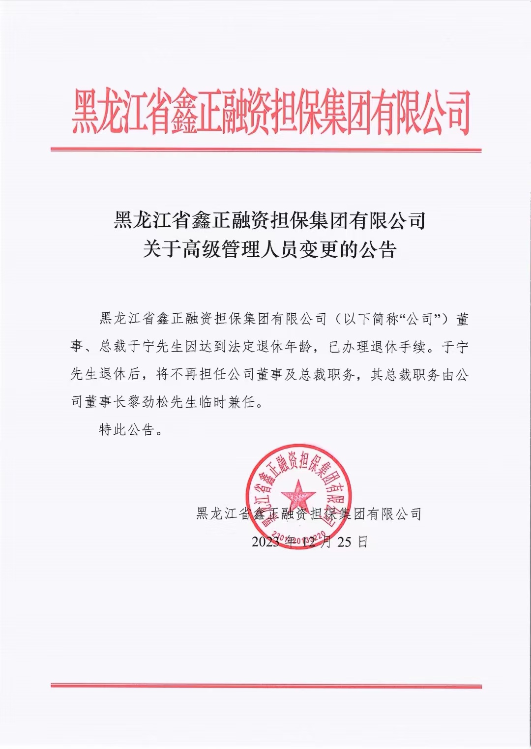 黑龙江省鑫正融资担保集团有限公司关于高级管理人员变更的公告