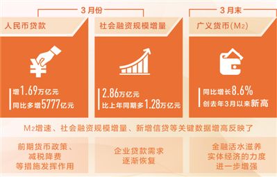 中国人民大学重阳金融研究院副院长董希淼认为,总体来看,3月份广义货币增速、社会融资规模增量、新增信贷等关键数据增高,是前期货币政策、减税降费等措施发挥作用的体现,同时企业贷款需求也在逐渐恢复,金融活水滋养实体经济的力度进一步增强。
